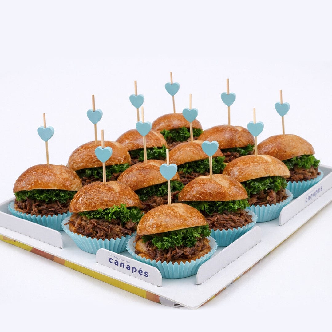 Deléitate con 12 mini hamburguesas de pechuga de res a la barbacoa texana de cocción prolongada, servidas en panecillos de pretzel frescos, cubiertas con salsa barbacoa de miel y kale crujiente. ¡Un bocado ahumado y sabroso, perfecto para tu próximo evento!