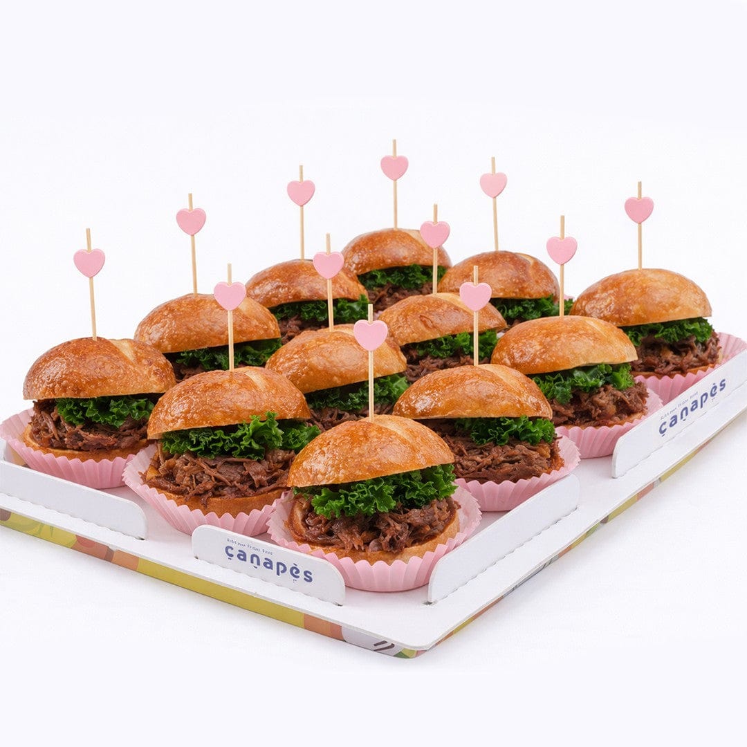 Deléitate con 12 mini hamburguesas de pechuga de res a la barbacoa texana de cocción prolongada, servidas en panecillos de pretzel frescos, cubiertas con salsa barbacoa de miel y kale crujiente. ¡Un bocado ahumado y sabroso, perfecto para tu próximo evento!